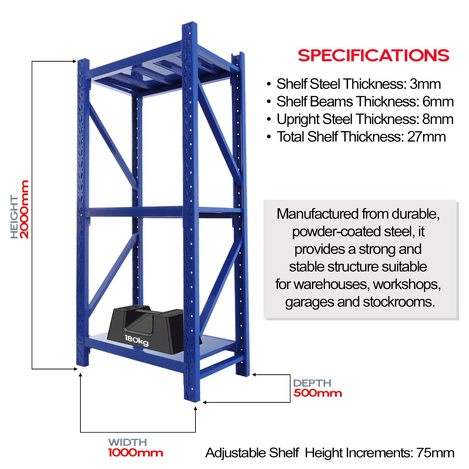 • Load Capacity: 180kg per shelf