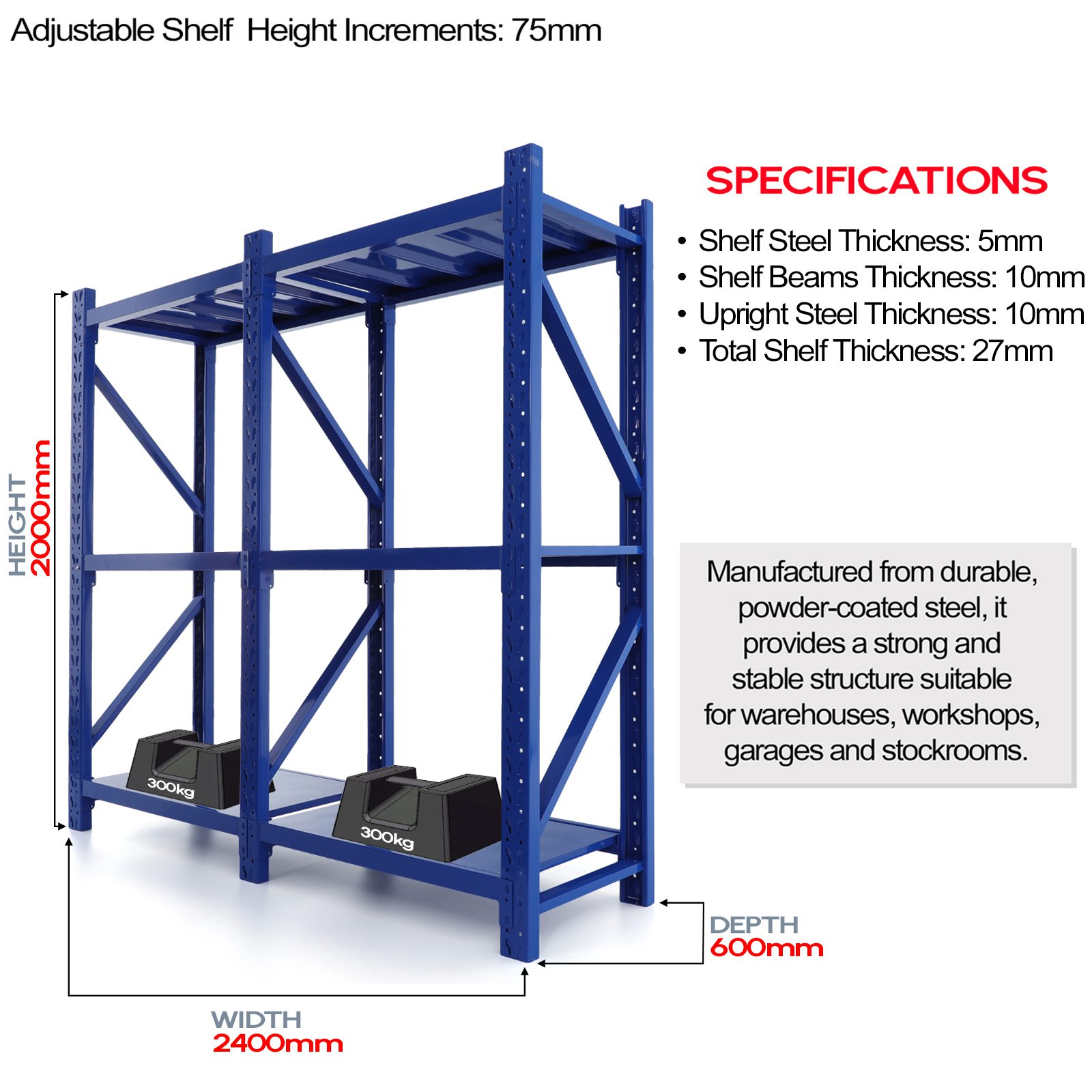 | Adjustable Shelf Height Increments: | 75mm |
