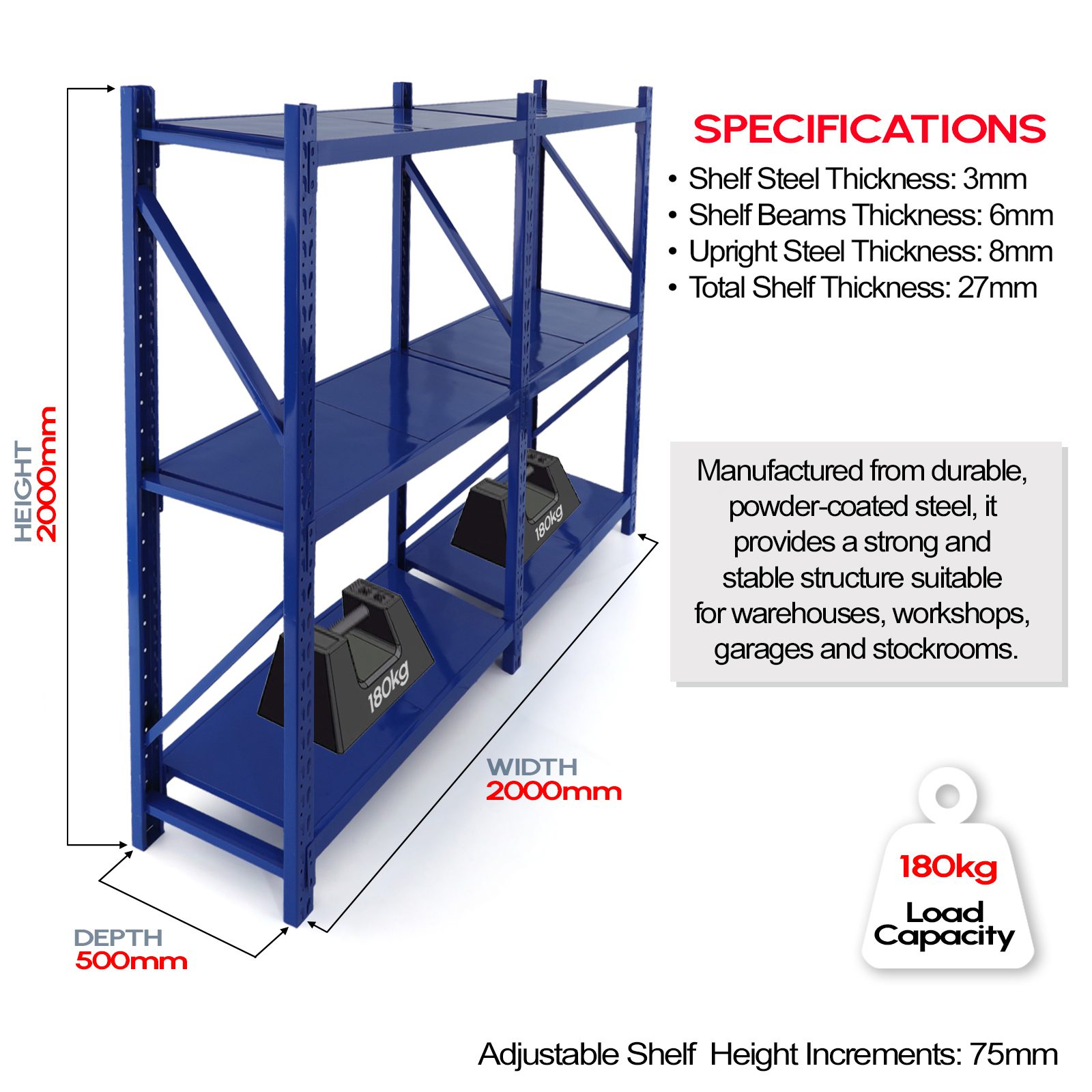 | Adjustable Shelf Height Increments: | 75mm |