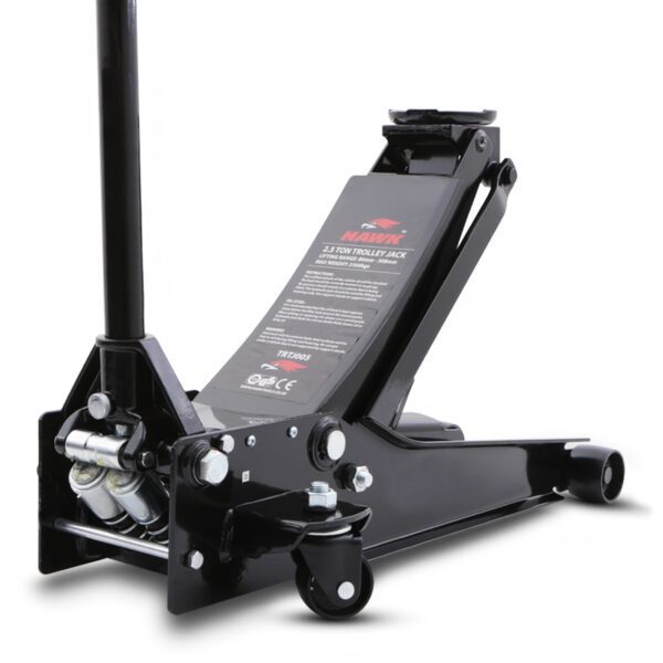 Our Hawk heavy duty trolley jack features a sturdy construction and superior hydraulic lifting mechanism, to effortlessly elevate cars, SUVs and light trucks. The smooth rolling wheels and compact design enable the jack to be easily positioned under vehicles, whilst the four included axle stands enable your vehicle to be safely and securely supported for maintenance.